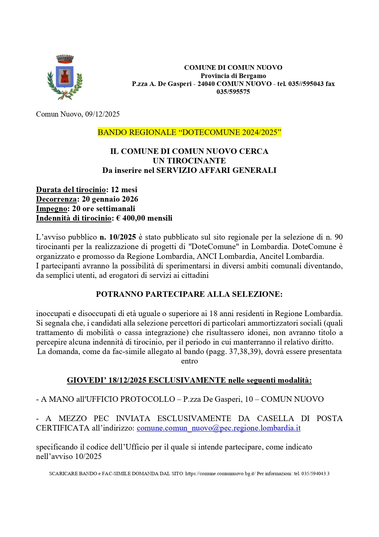 L’avviso pubblico n. 10/2025 è stato pubblicato sul sito regionale per la selezione di n. 90 tirocinanti per la realizzazione di progetti di "DoteComune" in Lombardia. DoteComune è organizzato e promosso da Regione Lombardia, ANCI Lombardia, Ancitel Lombardia.