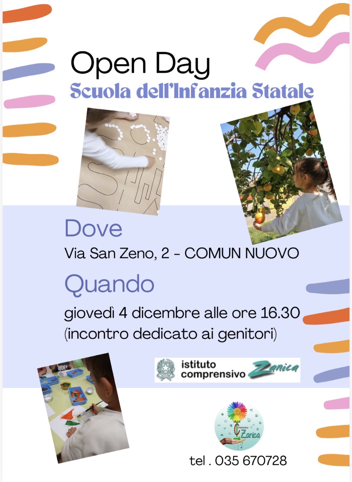 Si invitano le famiglie interessate all'open day della Scuola dell'Infanzia Statale che si terrà giovedì 4 dicembre 2025 alle ore 16.30.
